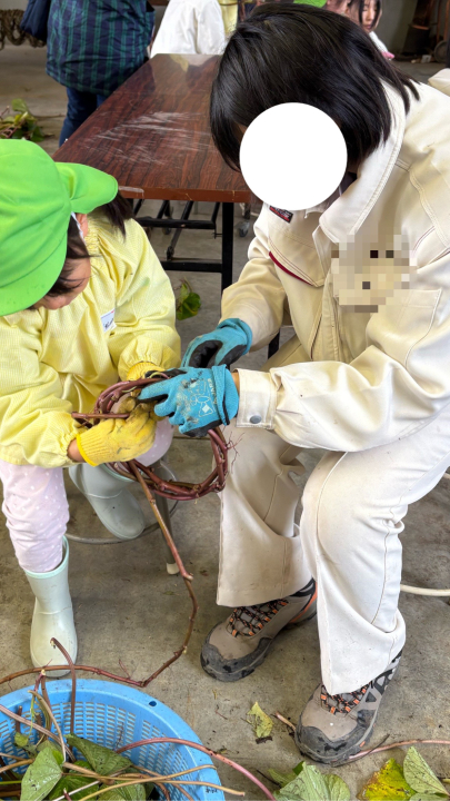 先日、年長さんが農林高校のお兄さんお姉さんと交流会をしてきました!生憎のお天気で春に植えたさつまいもを掘ることはできませんでしたが、さつまいものツルを使ったリースを作ってもらったり、ホクホクのお芋をいただいてきました☺️