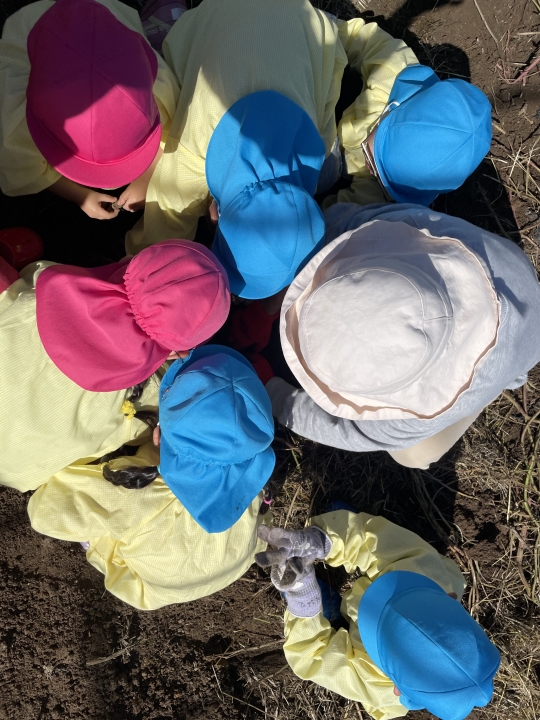 手を泥だらけにして夢中になって黙々と掘り出す子、土から顔を出すさつまいもを見て、「あった!」と歓声を上げる子、「だれか~!手伝って~!」と周りに助けを求めてお友だちと協力して掘り出す子。みんなそれぞれのお芋ほりを楽しみました。