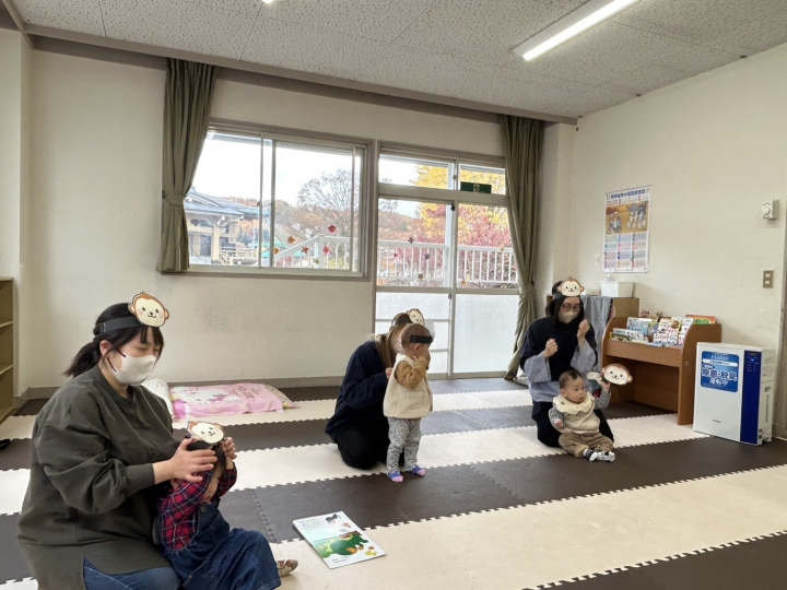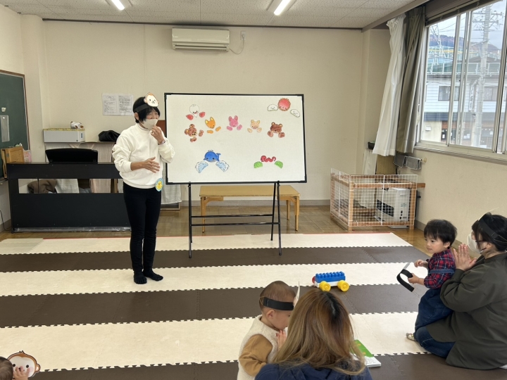 自由に遊んだ後は、「みんな一緒にいないいないばあ!」のパネルシアターが始まると、次々と出てくる動物を指差ししたりお家の方と一緒に手を叩いたりしながら参加してくださり、私達も楽しいひと時を過ごさせていただきありがとうございました。