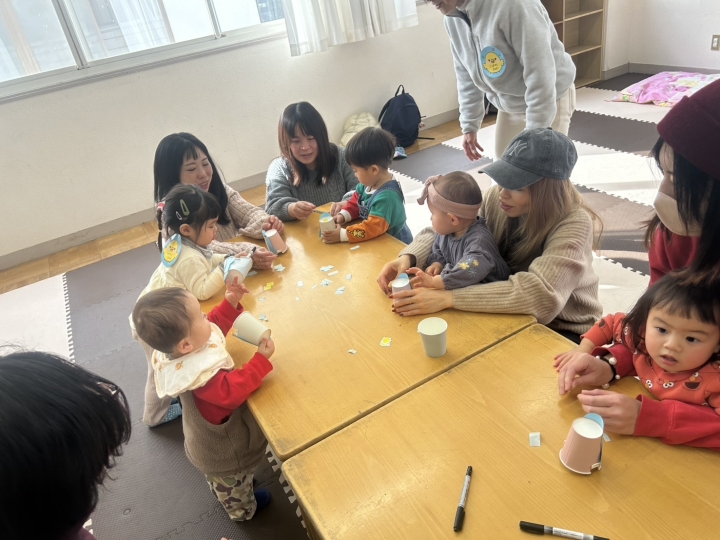 自由遊びの後は紙コップで作った「とことこペンギンちゃん」にシールで目や口を貼りつけて、それぞれのお顔ができ、トコトコ歩くペンギンに歓声があがっていました。