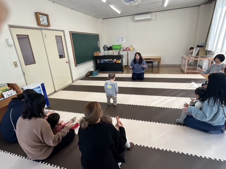 自由に遊んだ後は、発表会ごっこで、幼稚園の一番小さいこまくさ組のお友達が発表会で踊った「もこもこくも」を皆さんで踊ってみたり、大型絵本の「ぴょーん」では、次々とジャンプしながら出てくる動物に目を輝かせながら、集中して見て下さり嬉しかったです。