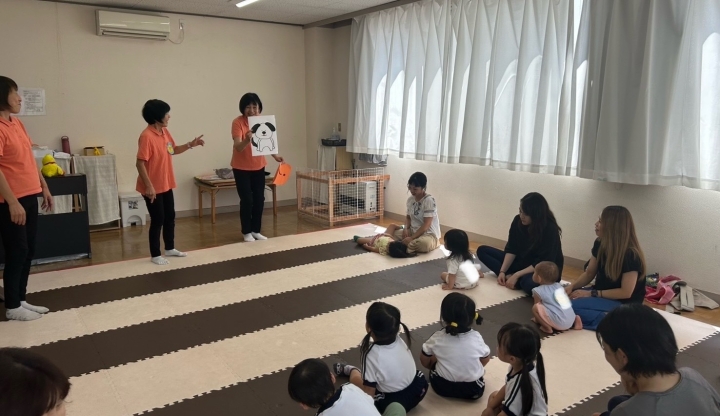 今回は、「スマイルポケット」さんにお越しいただき、秋のうたを歌ったり、「かわいいかくれんぼ」を踊ったりしました。